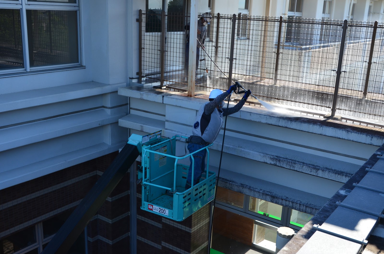 床・壁面の汚れを高圧洗浄機を使い落していきました。また、屋根防水・外壁の